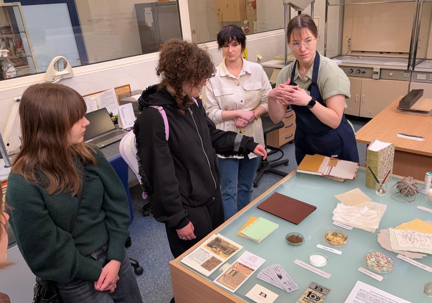 W pracowni mikrobiologicznej poznali niewidzialny świat mający ogromny wpływ na stan zbiorów – zobaczyli różne rodzaje grzybów wyhodowanych z książek, zajrzeli przez mikroskop (nawet w oczy pająka), a także dowiedzieli się, jak wyglądają próby badania czystości powietrza oraz jak działa komora fumigacyjna wykorzystywana do dezynfekcji obiektów. Podczas pokazów konserwacji i introligatorstwa zobaczyli, jak wygląda proces ratowania zniszczonych książek – od oczyszczania i wzmacniania papieru, po szycie i wykonywanie opraw. Poznali różne rodzaje opraw dawnych i współczesnych oraz specjalistyczne narzędzia wykorzystywane w tej pracy.